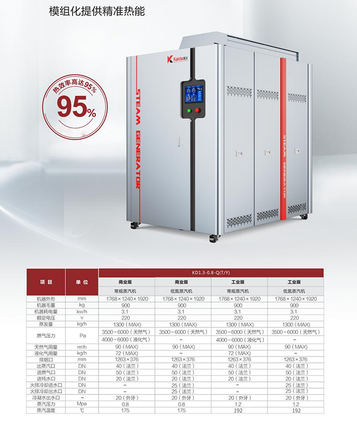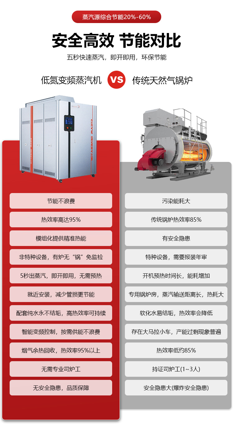 低氮變頻蒸汽機(jī) 非特種設(shè)備,有爐無“鍋”免監(jiān)檢 5秒出蒸汽,即開即用,無需預(yù)熱 就近安裝,減少管損更節(jié)能 配套純水永不結(jié)垢,高熱效率可持續(xù) 智能變頻控制,按需供能不浪費(fèi) 煙氣余熱回收,熱效率95%以上 無需專業(yè)司爐工 無安全隱患,品質(zhì)保障