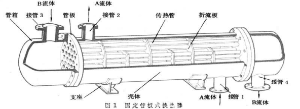 接管2流出。B流體從接管3流入,通過管內(nèi)從接管4流出。如果A流體的溫度高于B流體,熱量便通過管壁由A流體傳遞給B流體;反之,則通過管壁由B流體傳遞給A流體。殼體以內(nèi)、管子和管箱以外的區(qū)域稱為殼程,通過殼程的流體稱為殼程流體 (A流體)。管子和管箱以內(nèi)的區(qū)域稱為管程,通過管程的流體稱為管程流體(B流體)。