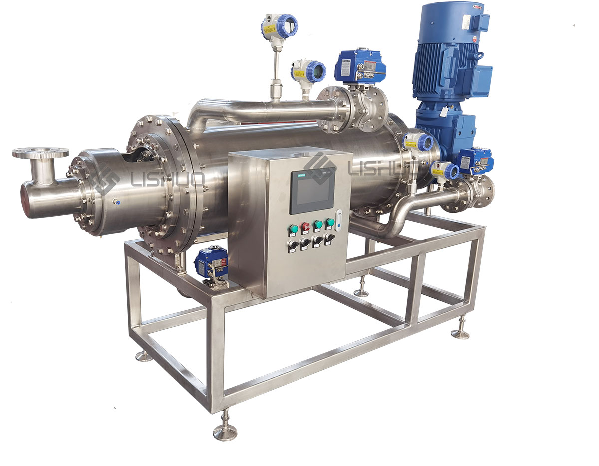 旋流換熱器可以用于多種工藝流程,在換熱器內(nèi)部,傳動(dòng)軸在換熱器內(nèi)部旋轉(zhuǎn),物料會(huì)通過軸和換熱管形成的通道,加熱或冷卻介質(zhì)在夾套中流動(dòng)。在運(yùn)行過程中,旋轉(zhuǎn)換熱面連續(xù)不斷地?cái)嚢栊D(zhuǎn)運(yùn)動(dòng)增強(qiáng)換熱效果,同時(shí)攪拌產(chǎn)品使溫度更為均勻更準(zhǔn)確,減少物料集聚和機(jī)械減載,這種設(shè)計(jì)可以減少管內(nèi)產(chǎn)品的積聚,還可以平衡受力,防止軸發(fā)生彎曲。在占地面積有限的空間內(nèi),換熱器可以垂直安裝,可以對(duì)軸進(jìn)行拆卸,便于檢查和維護(hù)。且?guī)в凶詣?dòng)清洗功能,智能簡(jiǎn)單易操作。